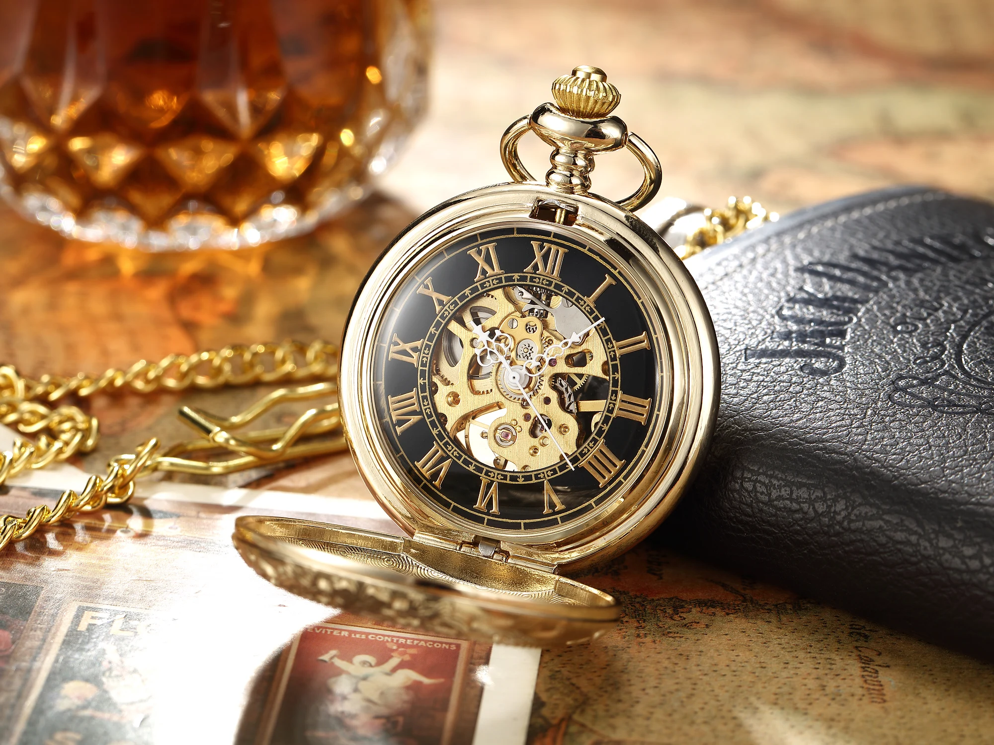 Luxury Retro Golden Hollow Skeleton Mechanical Pocket Watch Mens